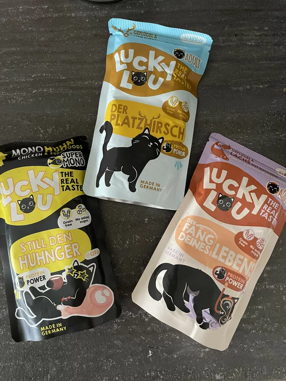 LuckyLou überzeugt mich gleich auf zwei Weisen: durch hohe Qualität ihres Futters und lustige Namen und Sprüche auf ihrem Futter. LuckyLou zu füttern, macht einfach doppelt Spaß!